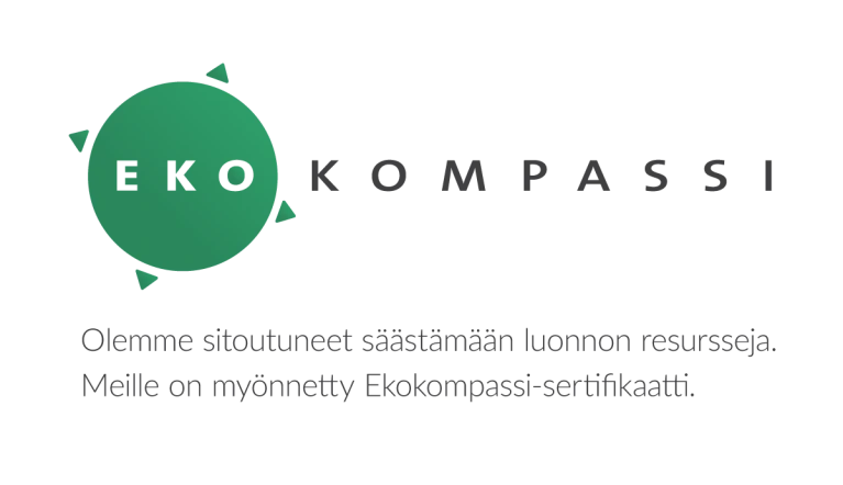 Olemme ottaneet käyttöön Ekokompassi-ympäristöjärjestelmän. Ekokompassi on kansainväliseen ISO 14001 -standardiin pohjautuva käytännönläheinen ympäristöjärjestelmä, joka auttaa tunnistamaan ja vähentämään toiminnan merkittävimpiä ympäristövaikutuksia. Se perustuu konkreettisiin tavoitteisiin ja säännölliseen ulkoiseen auditointiin. Ekokompassin omistaa Suomen luonnonsuojeluliitto.